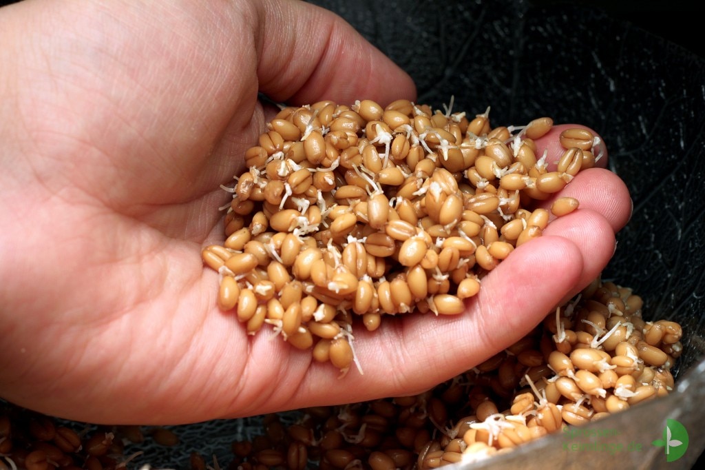Zu Beginn müssen die Körner in zimmerwarmen Wasser 12 Stunden eingeweicht werden. Anschließend werden diese Körner zweimal täglich gewässert. Nach 2-3 Tagen fangen die Weizenkörner an zu keimen und können geerntet werden.